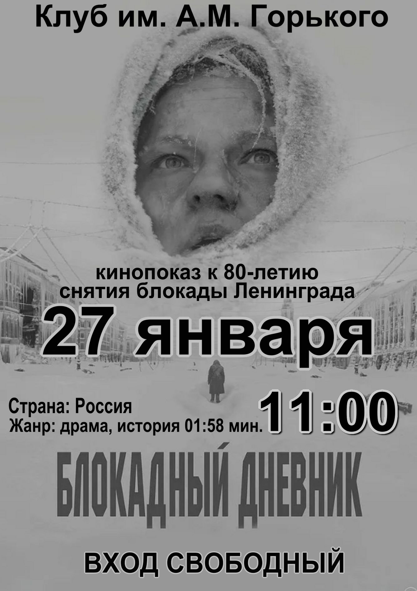 Год производства 2020 Страна Россия Жанр драма, история, военный Режиссер Андрей Зайцев Сценарий Андрей Зайцев Возраст 12+ Время118 мин. / 01:58 Февраль 1942 года, лютые морозы, страшный голод. Не работает водопровод и электричество, транспорт стоит, Ленинград завален снегом и парализован. Молодая женщина Ольга идёт через весь город к своему отцу. Она только что похоронила мужа и уверена, что скоро тоже умрёт от голода. Она хочет в последний раз увидеть своего отца и проститься с ним.